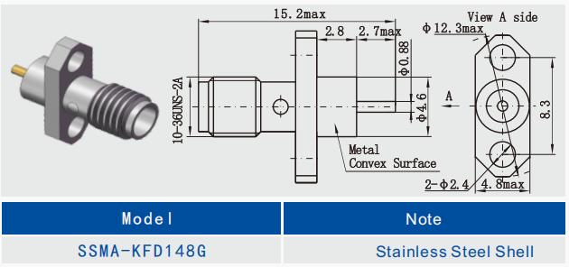 2 hole Flange Mount Stainless Steel Housing SSMA Jack RF Coax Microstrip Connectors : SSMA-KFD148G (Unit: mm)